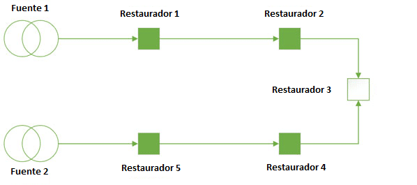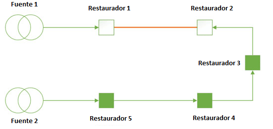 La red tipo anillo permite aislar de forma efectiva un punto de interconexión de un alimentador con falla, utilizando el punto de enlace, en este caso el restaurador 3, el cual deberá cerrar hacia la ubicación de la falla. Por ejemplo, supongamos que la falla ocurre entre los restauradores 1 y 2, una red que se vuelve a conectar manualmente aislando la falla y restaurando el suministro, quedaría de la siguiente forma: